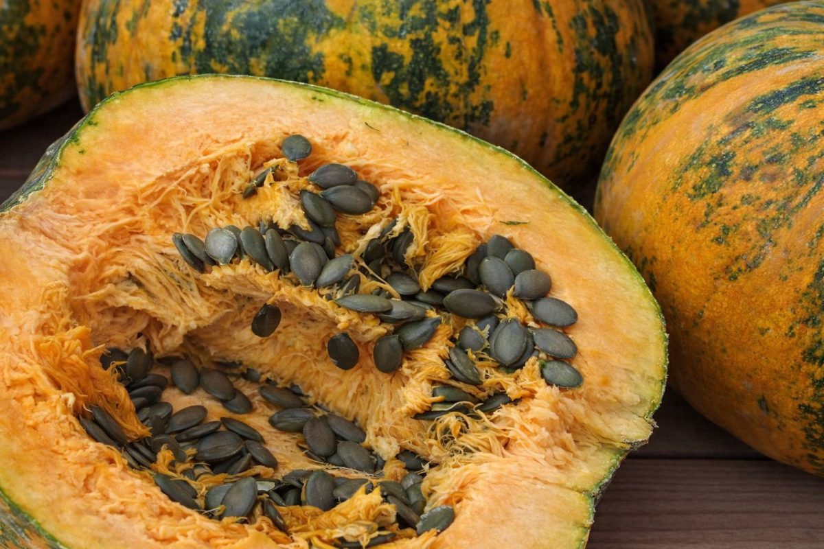 Уникальная разновидность твердокорой тыквы, которую выращивают ради одного главного сокровища — семян, полностью лишенных жесткой панцирной оболочки. Растение мощное, раскидистое, формирует округлые плоды весом 3-5 килограммов. Кора окрашена в желто-зеленые полосы, со временем может становиться более оранжевой.