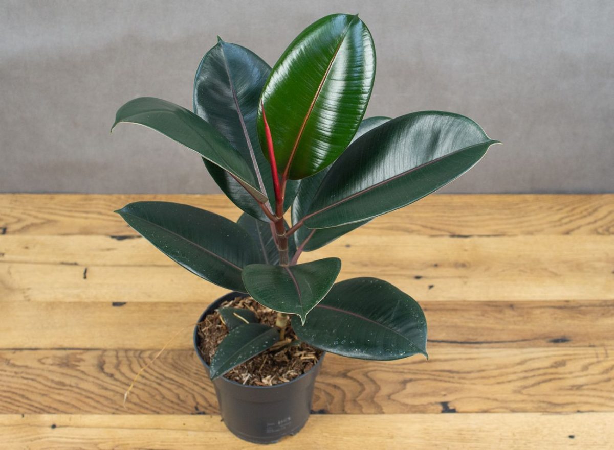 - «Абиджан» (Ficus elastica ‘Abidjan’) с очень темными, бордово-черными глянцевыми листьями. Он выглядит невероятно стильно в современном интерьере. По выносливости он не уступает «Робусте», но его темная листва лучше сохраняет насыщенный цвет даже при небольшом затенении.