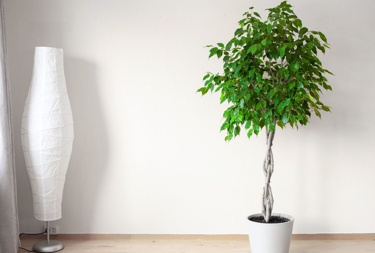 Фикус бенджамина – это уже другая история. Он выглядит элегантно и изящно: тонкие изгибающиеся ветви, мелкие аккуратные листья, воздушная крона, которая создаёт лёгкий силуэт. В интерьере такое растение смотрится дорого и благородно, особенно если вырастить его в один ствол или сплести несколько стволов косой. Но это уже не «поставил и забыл».