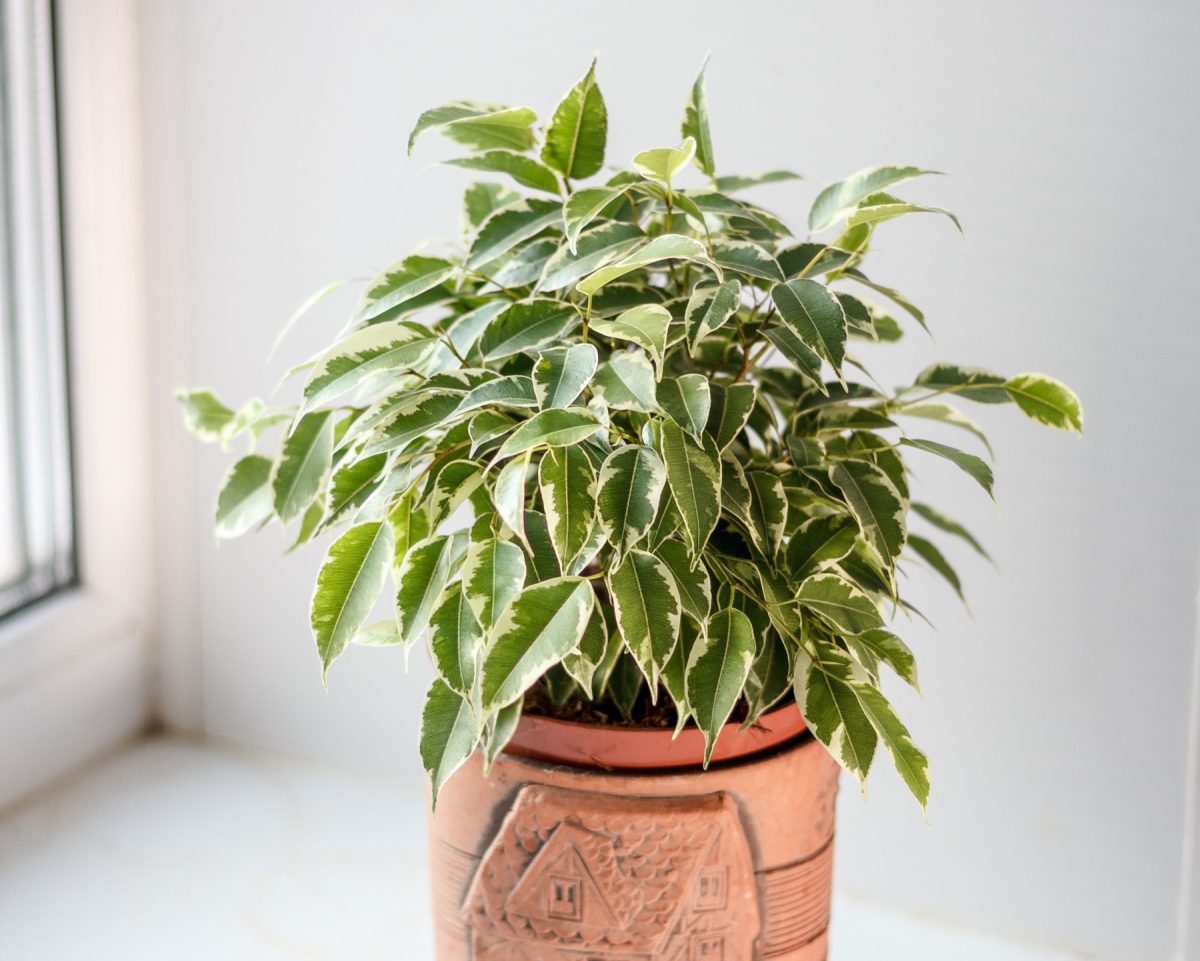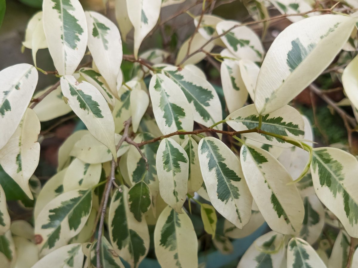 - «Старлайт» (Ficus benjamina ‘Starlight’) интересен бело-зелёной листвой, которая добавляет света даже в не самые яркие углы комнаты, но он требует больше освещения из-за пестроты.