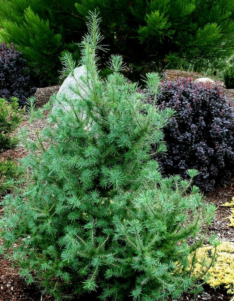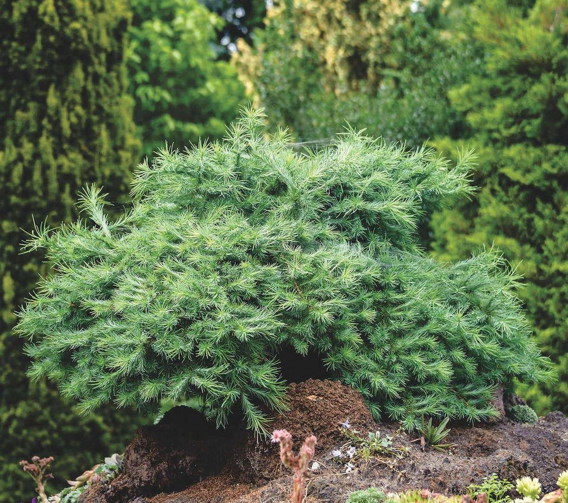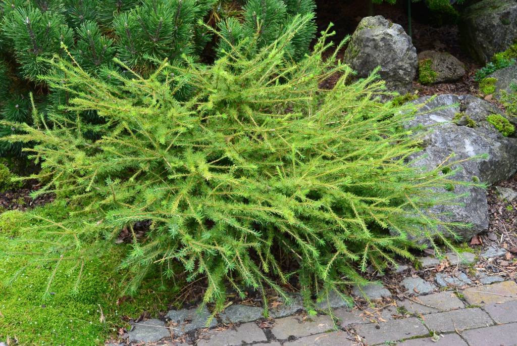 - Лиственница японская «Якобсен» (Jacobsen) — карликовое деревце с узко-конической кроной. Хвоя с легким сизым оттенком. Вырастает до 2,5-3 метров.