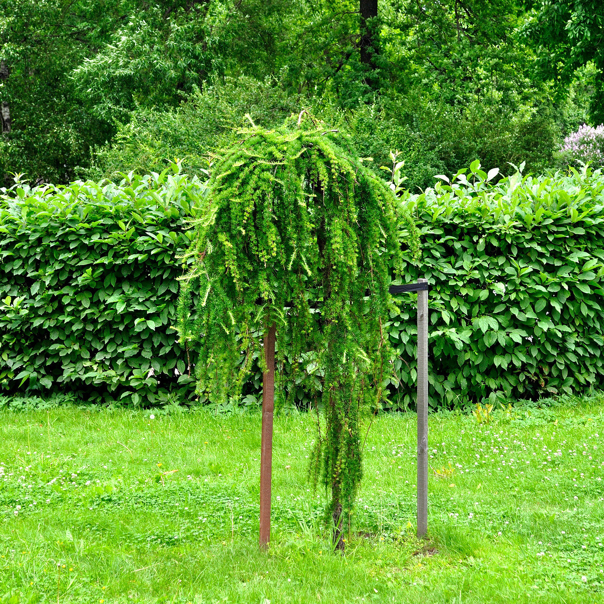 - Европейская лиственница «Пендула» (Pendula) — эффектное дерево с плакучей кроной нерегулярной формы. Высота зависит от штамба, максимально дерево может достигать 10 метров. Молодые шишки фиолетовые.