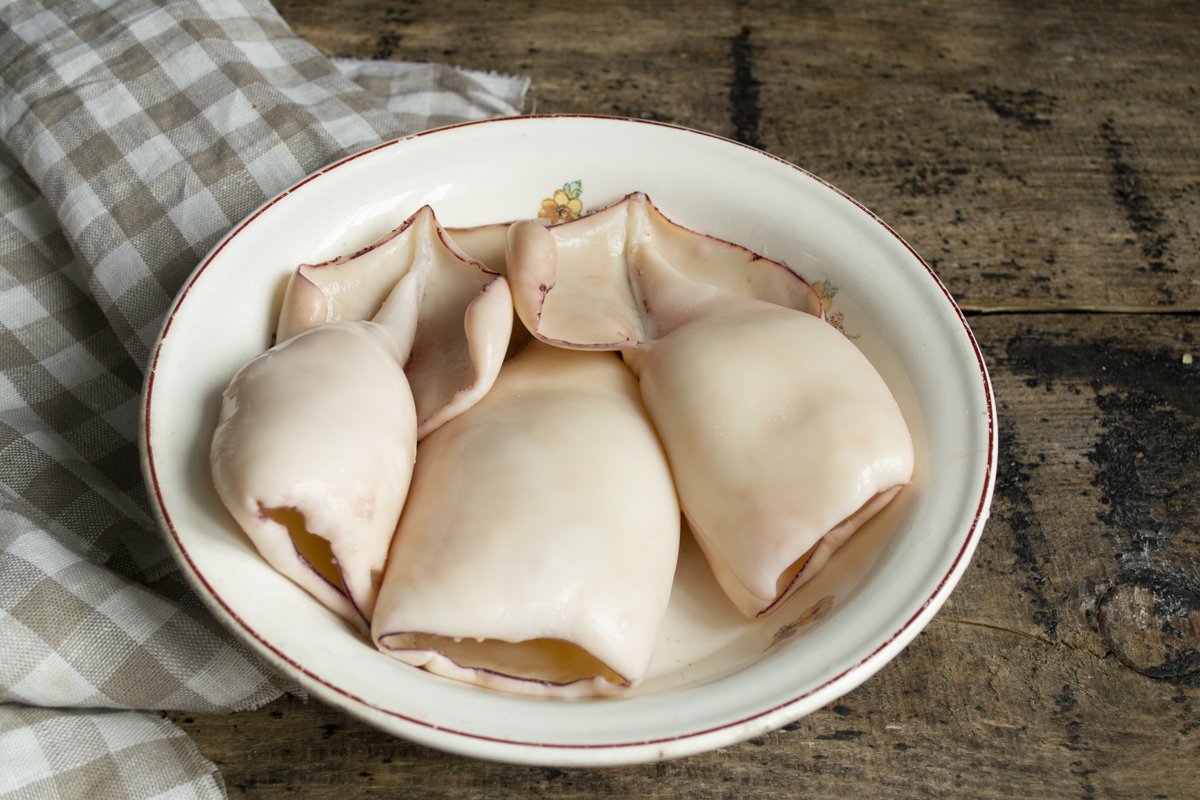 Очищенных от внутренностей кальмаров по очереди опускаем в кипящую воду на 2-3 минуты, сразу перекладываем в холодную воду, промываем, чтобы смыть всё лишнее. Подготовленные тушки выкладываем на бумажные полотенца, обсушиваем.
