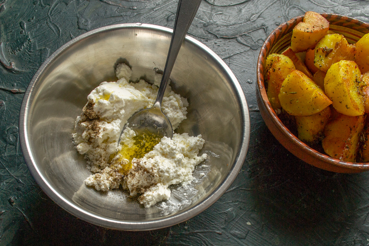 Делаем творожный соус. К мягкому домашнему творогу добавляем оливковое масло холодного отжима, щепотку соли и щепотку молотого чёрного перца. Домашний творог можно заменить мягким сливочным творожным сыром, важно, чтобы консистенция была кремовой, без крупинок.