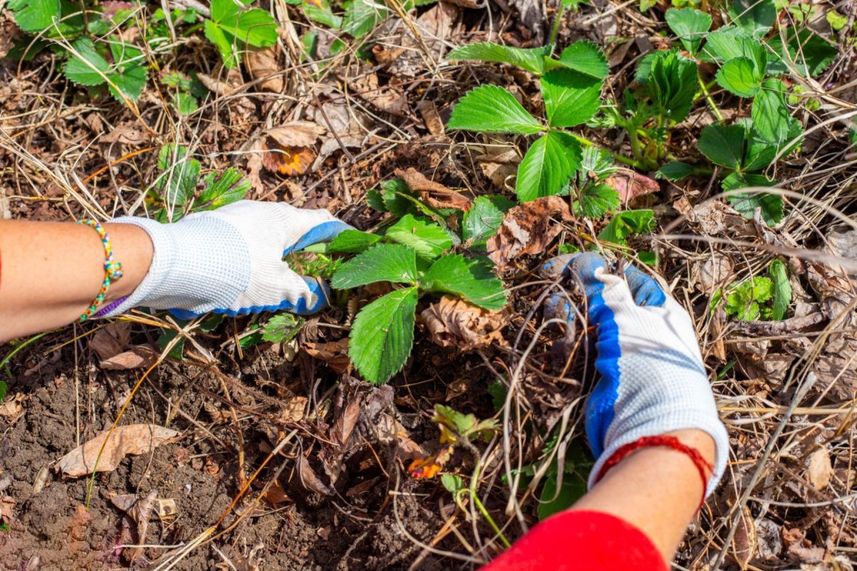 Убирать нужно руками или ножницами. Не рвите листья рывком, это самый быстрый способ выдернуть куст вместе с корнями. Клубника после зимы сидит неплотно, земля рыхлая, один резкий дерг – и вы держите в руке целый куст. Лучше срезать у основания.