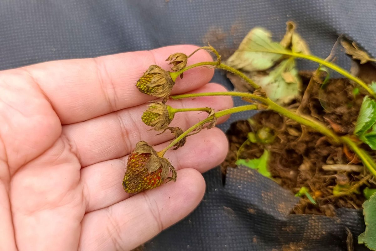 Подгнившие остатки ягод, усов, цветоносов. Это всё тоже убираем. Всё, что выглядит мертвым и разлагающимся, должно уехать в компост или в мусор (если были болезни – только в мусор, не в компост).