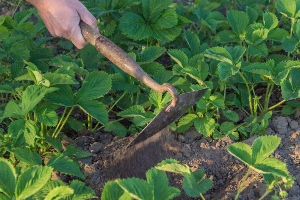 - Инструмент – маленькая ручная тяпка или плоскорез. Большой садовой тяпкой на клубничной грядке делать нечего, это инструмент для картошки.