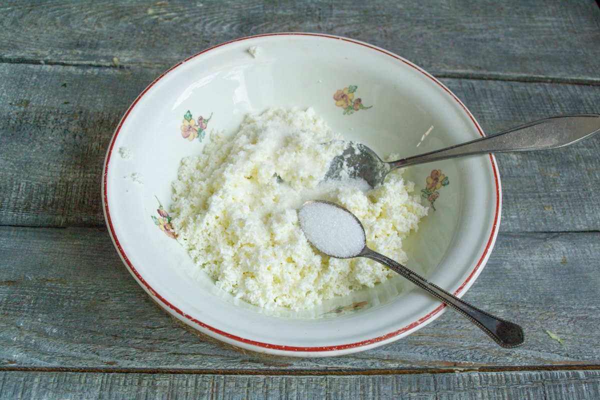 К протёртому творогу добавляем щепотку соли, сахарный песок, по вкусу можно добавить ванилин или пакетик ванильного сахара.