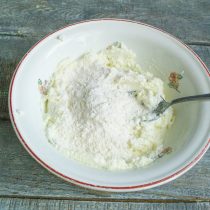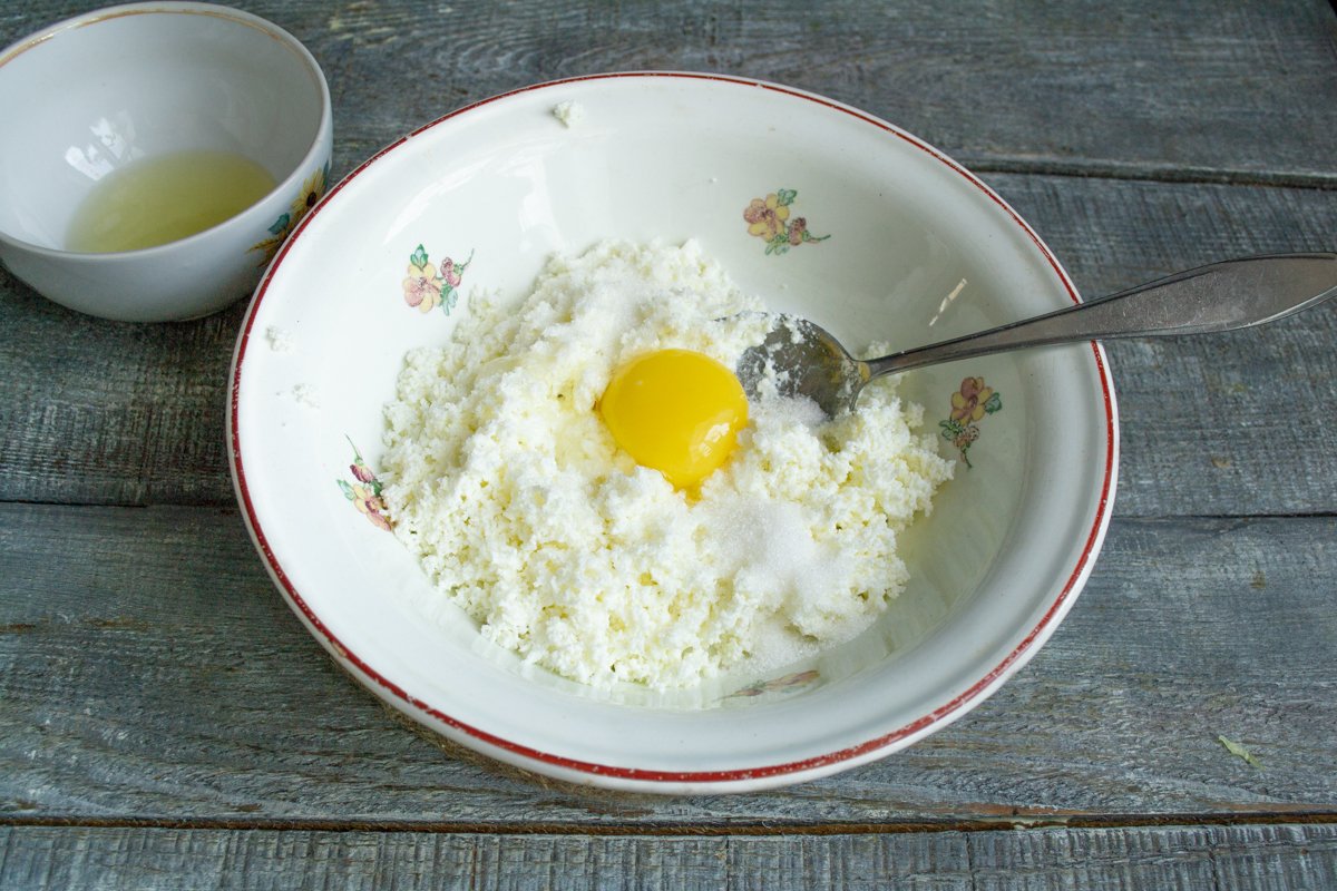 Смешиваем творог с желтком, насыпаем пшеничную муку или муку из мацы.