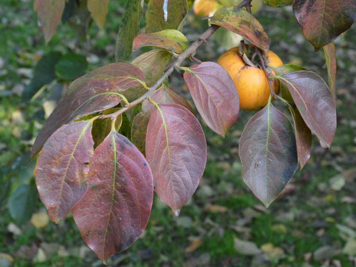Хурма принадлежит к листопадным культурам. Она сбрасывает листья еще до того, как созревают плоды, но это не мешает растению оставаться высоко декоративным. Листья с темным, благородным оттенком зеленого окраса создают изящную крону. Ширина до 6 см при длине до 12 см позволяет им выглядеть и броско, и достаточно элегантно. Перед тем, как начнется листопад, листья начинают пестреть, неравномерно перекрашиваясь во все более яркие оттенки карминного и красного.