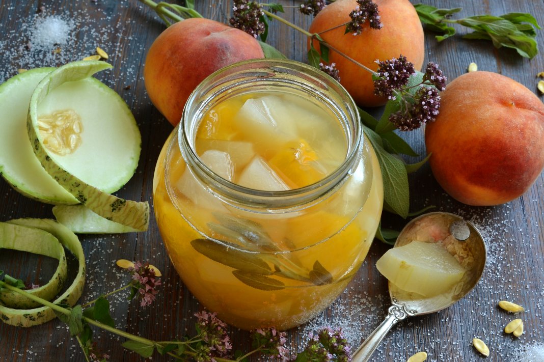 Способ приготовления компота из дыни с персиками и шалфеем на зиму.