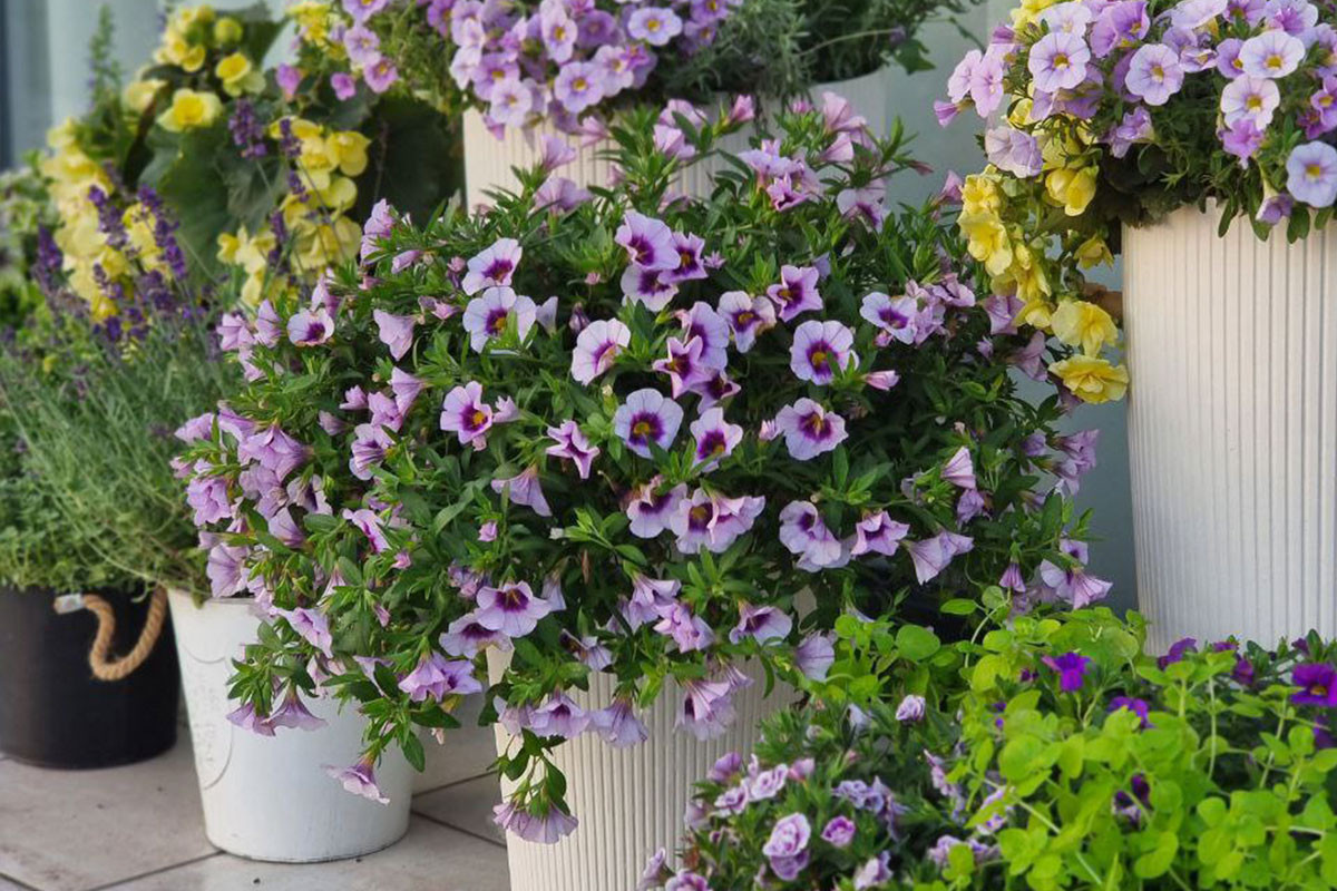 Что касается количества контейнеров, то оно вариативно. Всё зависит от места, где они будут размещены. Например, если вы хотите украсить зону террасы, то стоит использовать 9 кашпо: 2 базовых и 7 дополняющих.