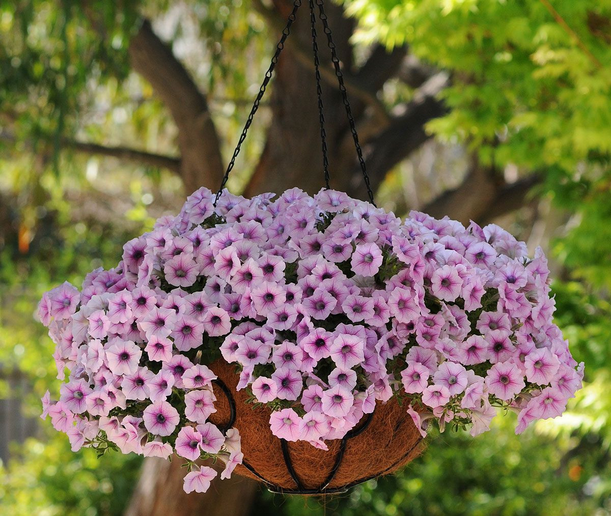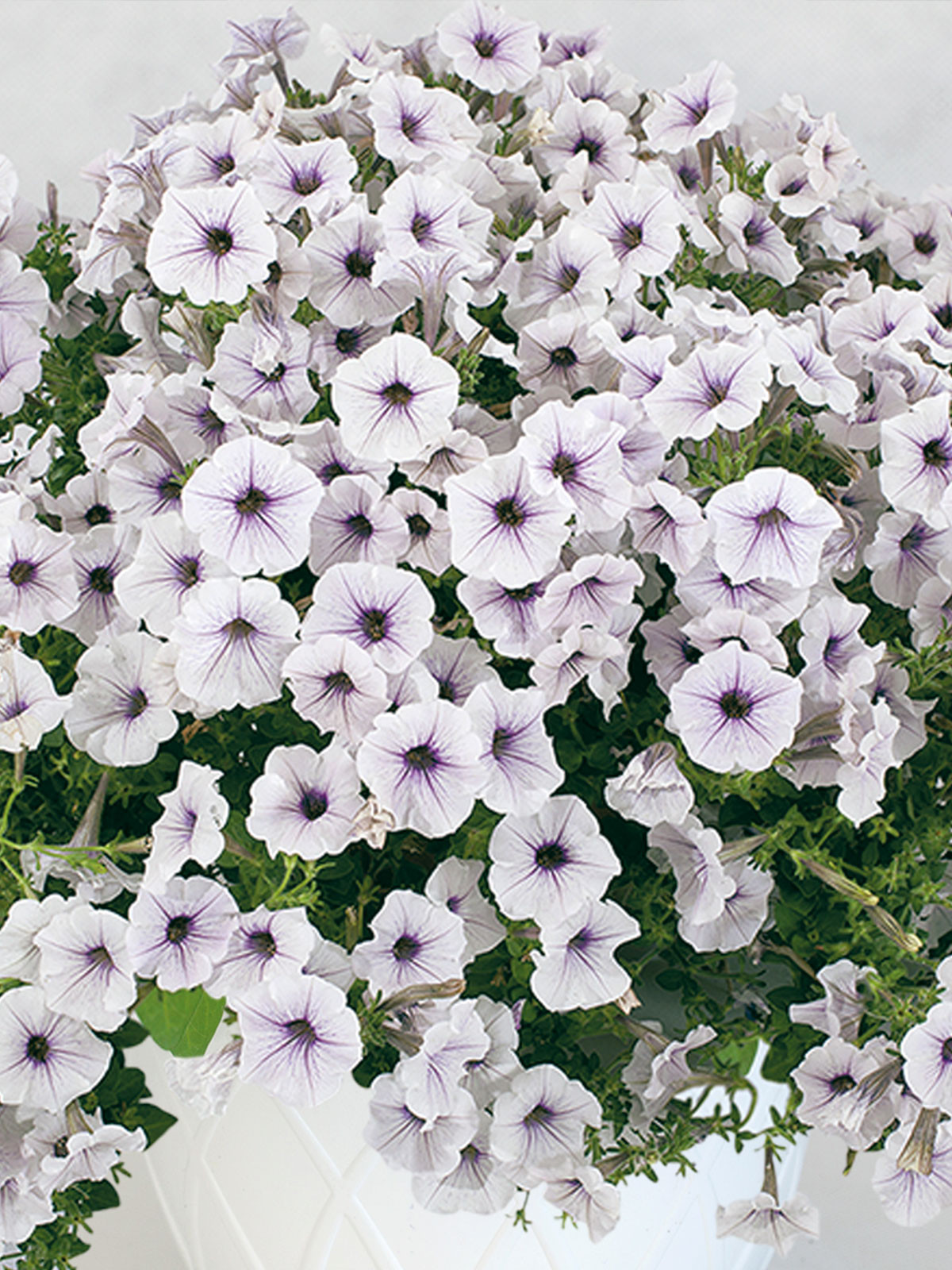 Следующий контейнер можно украсить петунией махровой многоцветковой Дуо Блю и петунией минифлорой Бэби Джоконда Блю, которые будут отлично контрастировать с душицей.