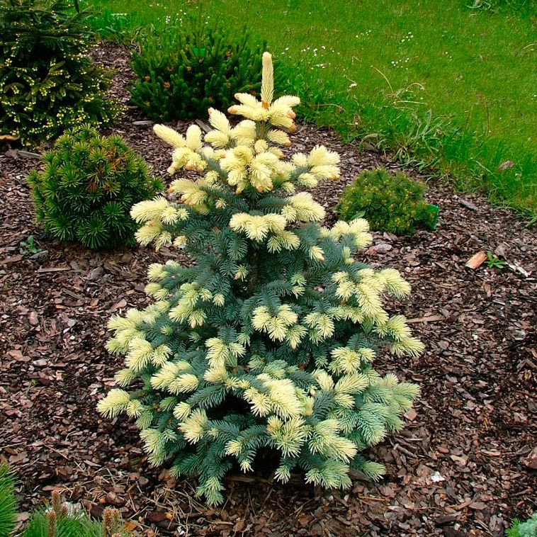 Формы с золотистыми кончиками побегов можно найти и у привычной нам ели обыкновенной. Ель обыкновенная «Альбоспиката» (Picea pungens ‘Albospica’) — это дерево пирамидальной формы с необычной окраской хвои. Молодые весенние побеги ее желтовато-белые, чудесно контрастирующие с изумрудной старой хвоей. К середине лета привлекательный цвет побегов постепенно становится серебристо-голубым. Годовой темп прироста 10–20 см, что позволяет получить дерево 1-2 метров в высоту и 0,8 метра в ширину через 10 лет.