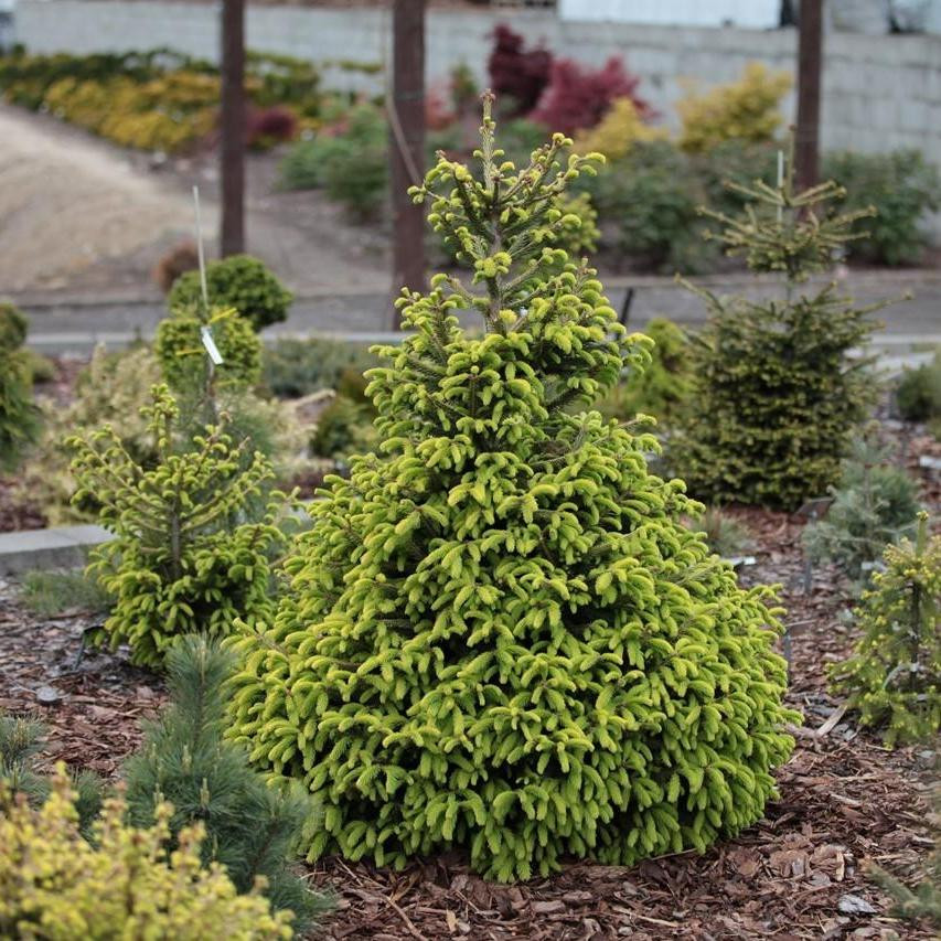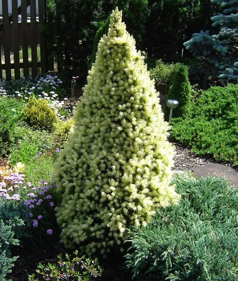Очень популярны формы с золотистыми приростами у знаменитой карликовой ели канадской. Ель канадская «Дейзиес Вайт» (Picea glauca ‘Daisy’s White’) — это разновидность популярной карликовой ели «Коника», которая имеет очень схожий с ней конический габитус. Для сорта характерен очень медленный рост, в 10 лет деревце достигает около 80 см в высоту. Побеги жесткие, иглы короткие бледно зеленые. Сорт имеет два прироста в течение года: желто-белый весной и фисташковый летом.