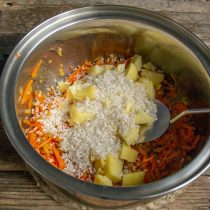 Обжариваем морковь с луком на маленьком огне, пока морковка не станет мягкой. На обжарку уйдет ещё примерно 5 минут.