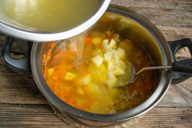 Морковь режем тонкой соломкой или натираем на крупной овощной тёрке. Кладём нарезанную морковку в кастрюлю.