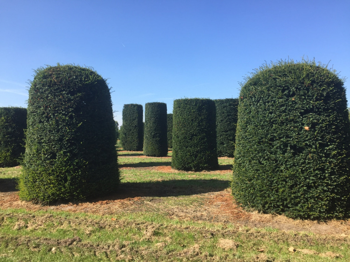 Для получения идеального цилиндра вокруг растения рисуют круг, по периметру которого устанавливают вертикальные направляющие шесты. Стрижку начинают сверху вниз, строго следя за соблюдением вертикалей. Форму цилиндра можно наращивать в высоту по мере роста растения. Или увенчать верхушку какой-нибудь другой фигурой, тем же шаром.