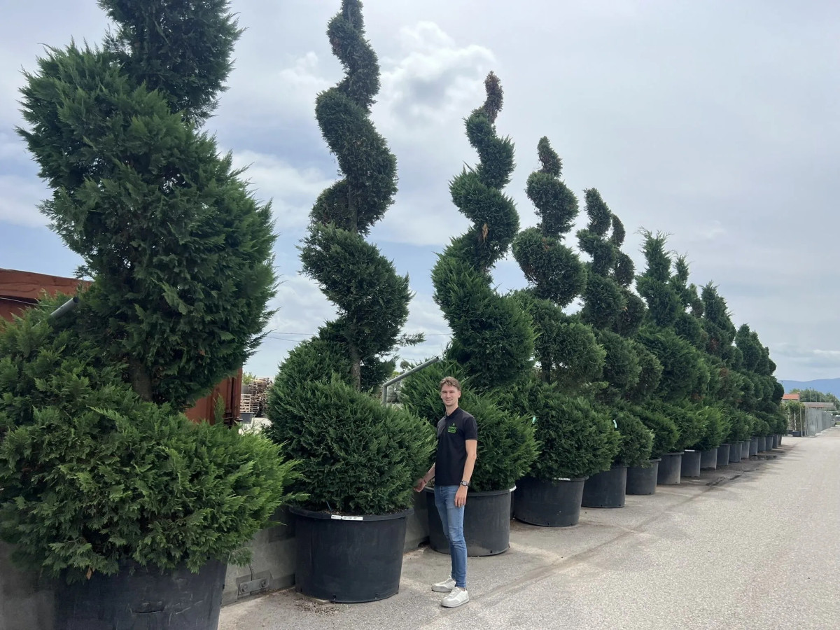 Для спирали подходят как одноствольные, так и многоствольные деревья. В первом случае может получиться максимально эффектная форма с глубокими витками, выстриженными до ствола. На кроне многоствольных деревьев витки скорее намечены, а растение в итоге напоминает десерт.