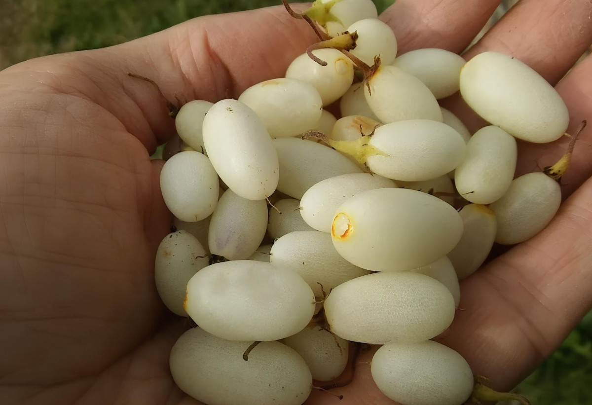 На грядке пампасный ландыш зацвёл в июне. Опять по шмелям определила. Нарос к этому времени густо и ростом до 50 см. Плодики завязал. С июля, как водится, жара и засуха, он опять затаился в плане дальнейшего роста и цветения. Но завязавшиеся плодики созрели! Габариты у них вполне мелкоягодные: 1–1,5 см в длину и не более 1 см в ширину, овальные. Вкус сладкий, но какой-то… никакой. Но вот послевкусие… Мне показалось ананасно-медовым, дети сказали — фруктовое, соседи определили как медово-фруктовое. Во вкусовых ощущениях вызывает некий когнитивный диссонанс: вкус невнятно-сладкий, а след оставляет приятный. Но много не съешь, это точно.