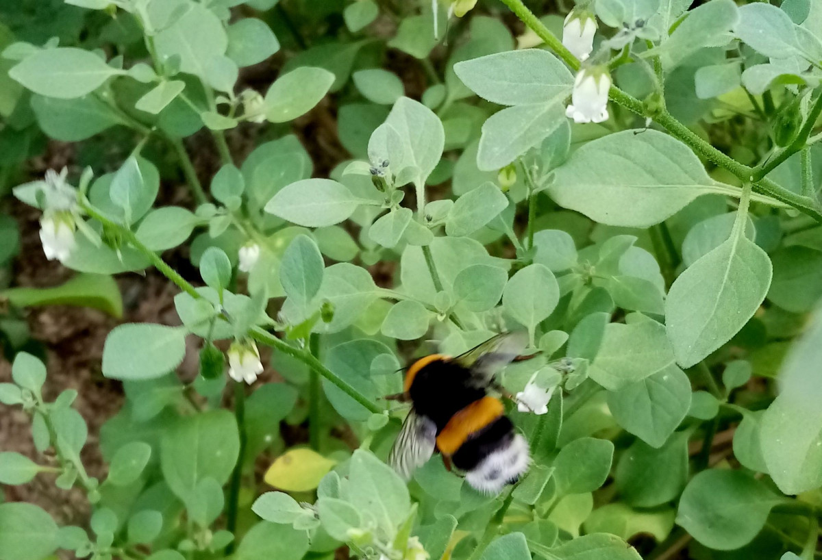 Я бы их и не заметила, если бы над грядкой не стоял густой шмелиный гул. Тяжеленные шмели как-то ухитрялись удерживаться на этих крошечных цветочках, хотя побеги ощутимо наклонялись. Зрелище завораживающее. Что характерно: пчёл на цветках я не увидела, хотя лететь им недалеко.