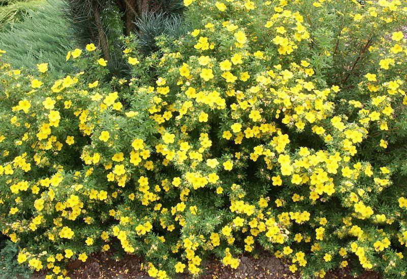 Самый высокорослый сорт, вырастающий до полутора метров в высоту и ширину — жёлтоцветковый «Голдфингер» (Potentilla fruticosa ‘Goldfinger’); (1,5; 1,5; 5).