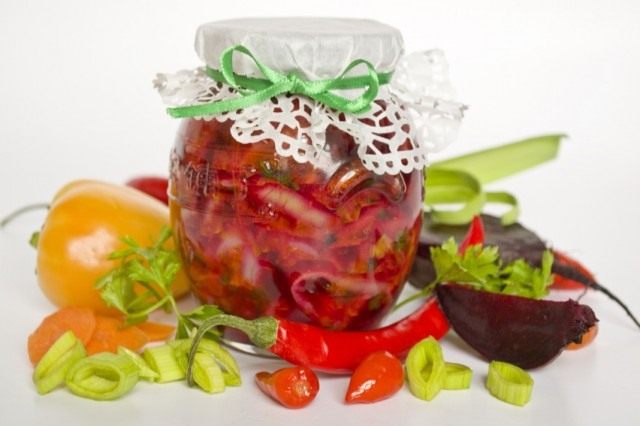 Заполняем горячими овощами стерилизованные банки, закрываем крышками. Стерилизуем банки ёмкостью 500 г 15 минут, а банки ёмкостью 1 литр — 25 минут. Готовое лечо со свёклой храним в прохладном месте.