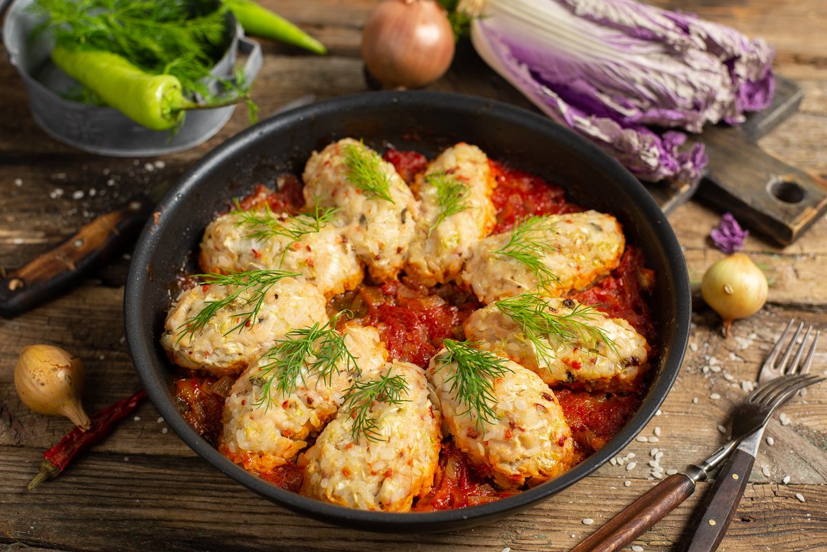 Выкладываем голубцы в соус так, чтобы между ними оставалось немного свободного места. Нагреваем духовой шкаф до 200 градусов по Цельсию. Отправляем сковороду в разогретый духовой шкаф на 25 минут.