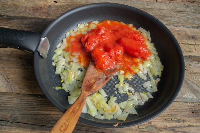 Режем мелко головку репчатого лука. В сковороде нагреваем столовую ложку растительного масла для жарки. Кладём нарезанный лук в разогретое масло, обжариваем 7 минут. Добавляем томаты, консервированные в собственном соку вместе с соком, насыпаем соль и сладкую паприку по вкусу, 1 чайную ложку сахара для баланса вкусов. Если томаты кислые, количество сахара можно увеличить. Тушим томатный соус 5 минут на среднем огне, если соус получается очень густым, добавляем немного куриного бульона или воды.