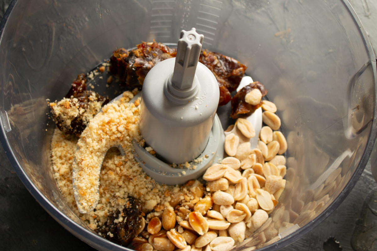 Делаем начинку для лимонного печенья. Финики очищаем от косточек, промываем проточной холодной водой. В чашу блендера кладём очищенные финики и жареный арахис.