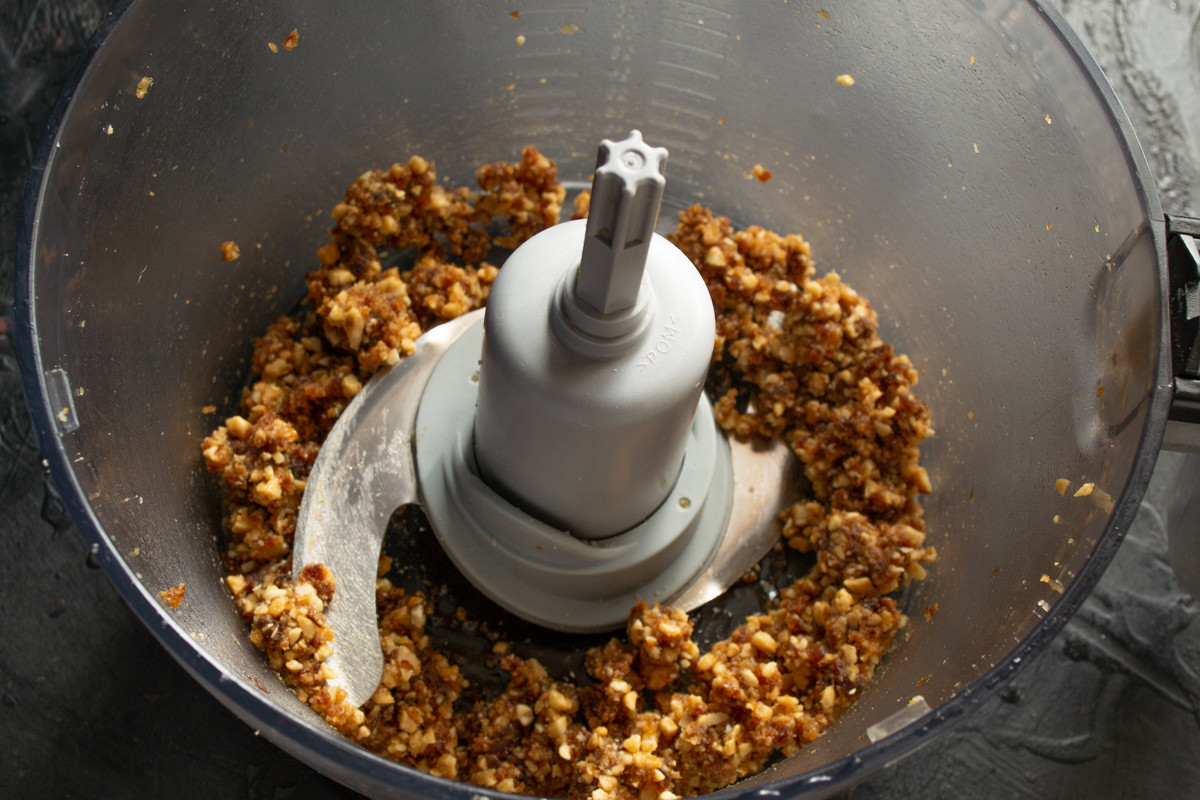 Добавляем мёд, половину чайной ложки молотой корицы и измельчаем ингредиенты начинки несколько минут, пока не образуется густая паста. Эта паста липкая, легко формуется.