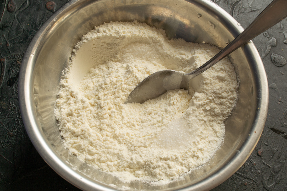 Делаем тесто. Смешиваем пшеничную муку высшего сорта и сахарный песок, добавляем ванилин или насыпаем 1-2 чайные ложки ванильного сахара.