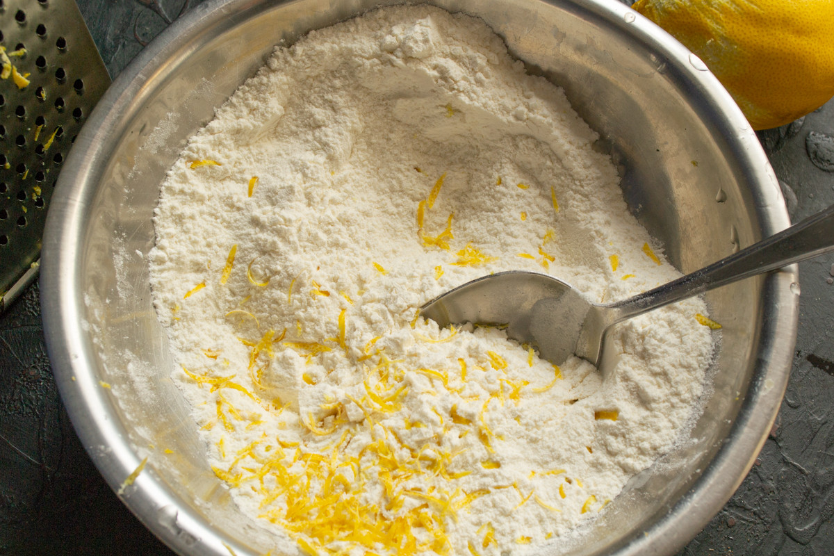 Тщательно, губкой с абразивным слоем моем лимон. Затем ошпариваем лимон кипятком и натираем на мелкой тёрке тонкий слой жёлтой цедры. Добавляем натёртую цедру к сухим ингредиентам.