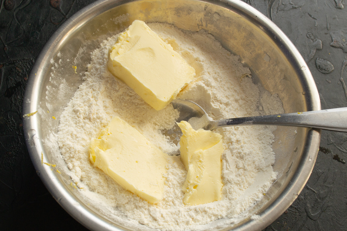 Холодное сливочное масло режем кубиками, добавляем в миску.
