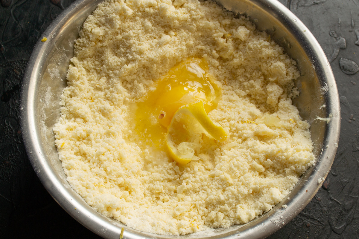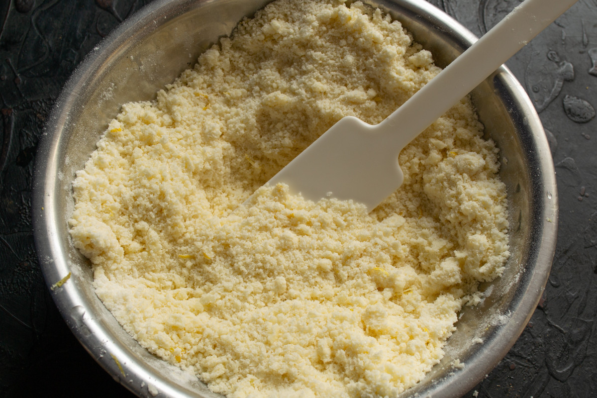 Растираем масло с мукой и сахаром руками. Получится масляная крошка, вкусно пахнущая ванилью и лимоном.