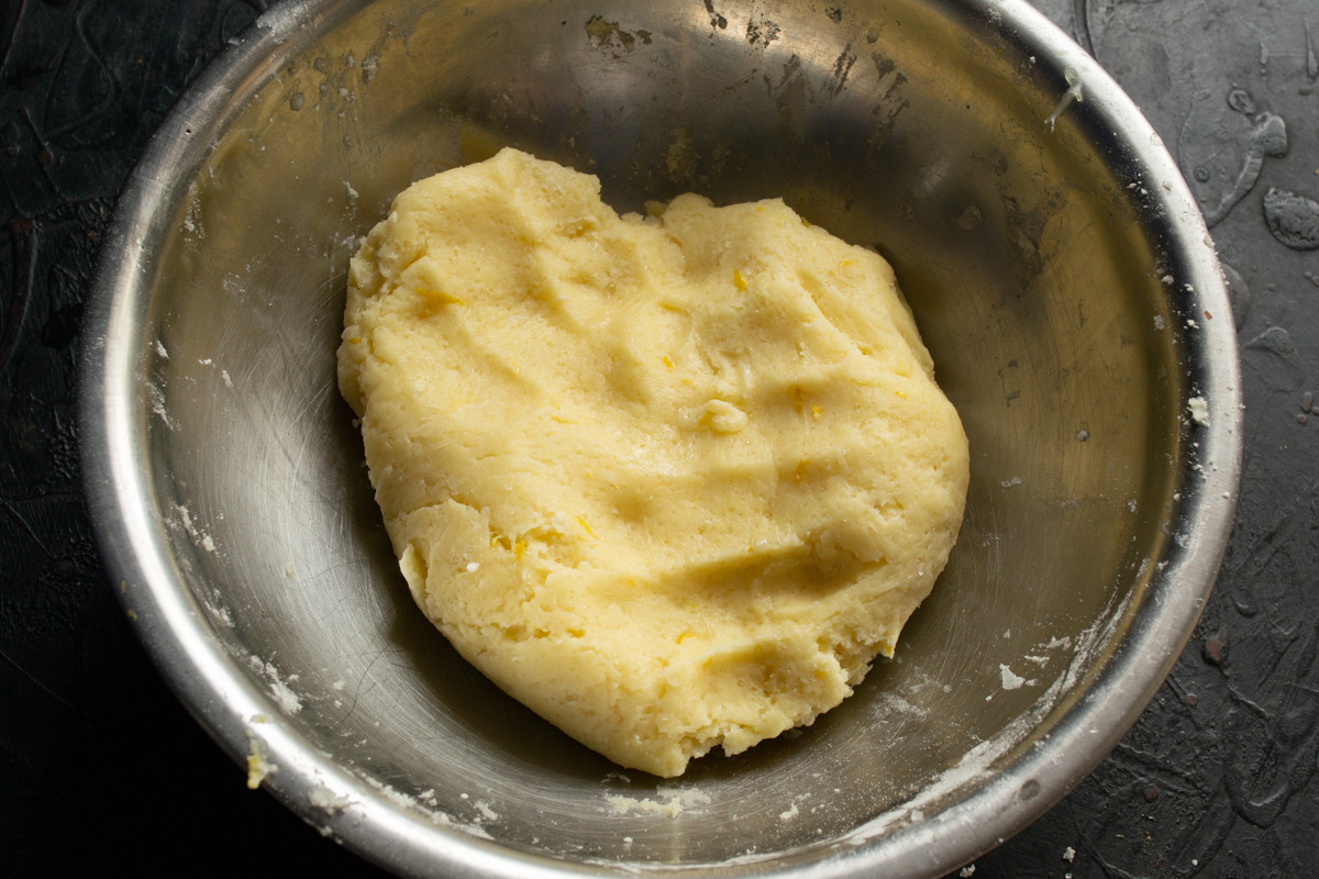 Замешиваем тесто, собираем в комок и заворачиваем в пищевую плёнку. Оставляем тесто в холодильнике на 30 минут.