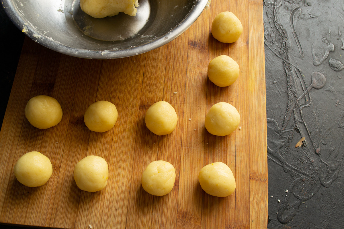 Делим тесто на небольшие кусочки весом 15-17 г. Скатываем аккуратные шарики. На 8 печений среднего размера понадобится 16 одинаковых шариков теста.