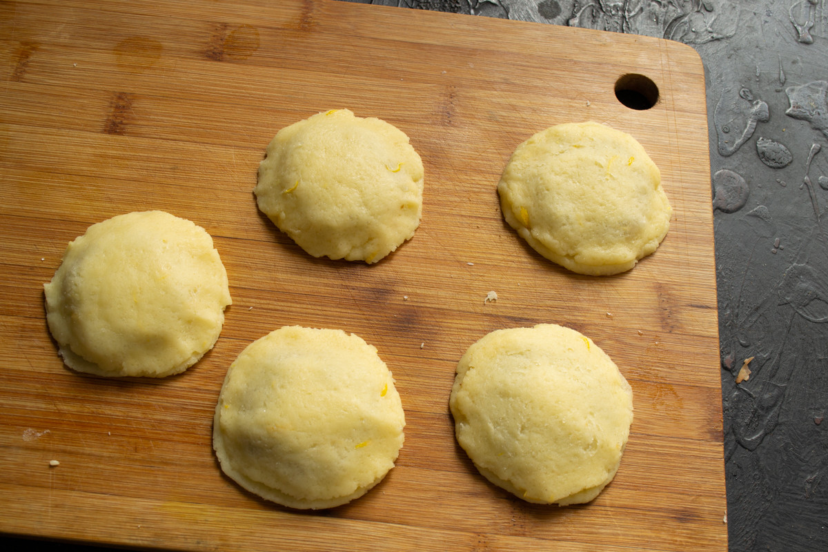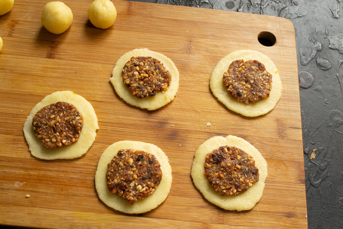 Раскатываем шарики теста в круглые тонкие лепешки. Начинку делим на 8 частей. Из начинки также скатываем шарики, расплющиваем, кладём в центр кружочков теста.