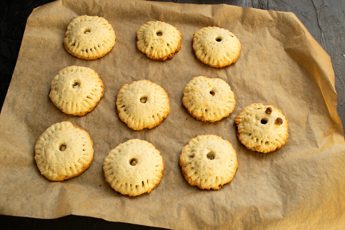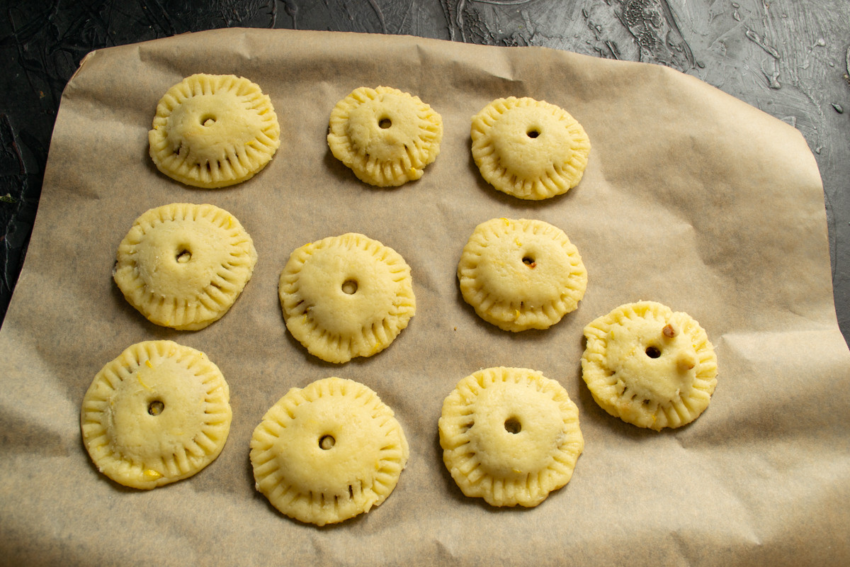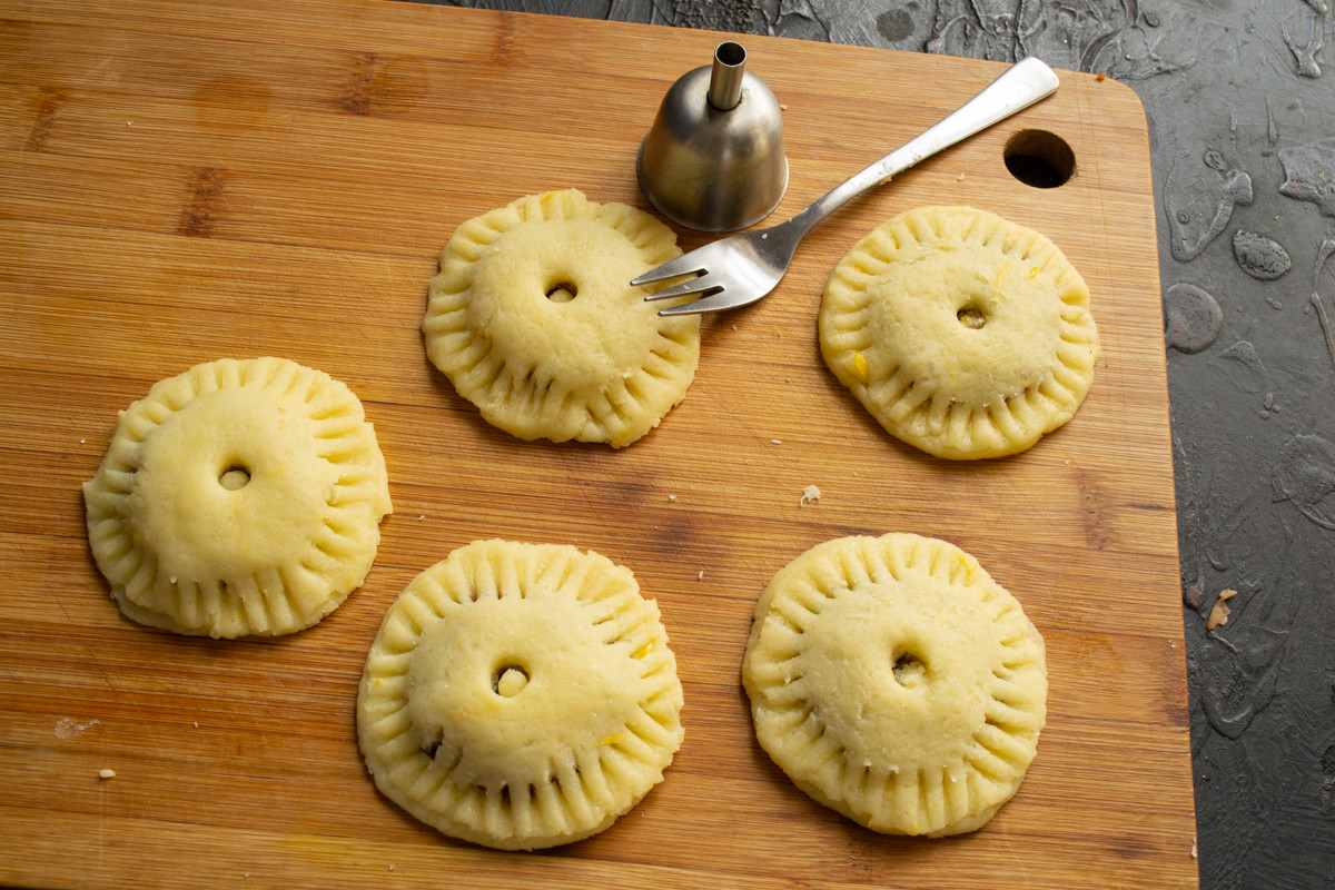 Края печенья прижимаем вилкой, делаем простой рельефный узор по кругу. В центре печений выемкой делаем отверстия для выхода пара.
