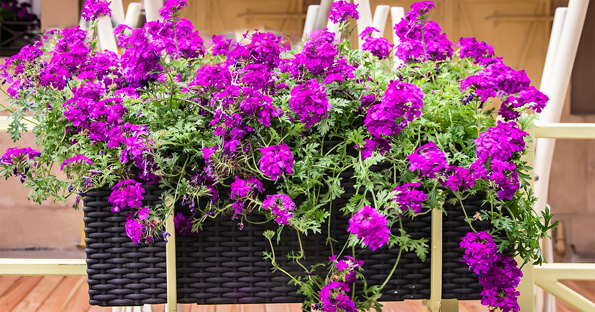 Относительно большие горшки (7-10 л), регулярные подкормки, полив и достаток света в течение всего сезона — это основные требования в уходе за этим шикарным цветком. Вербену можно выращивать в однолетнем цикле или в многолетнем, если убирать горшки на зиму в дом.