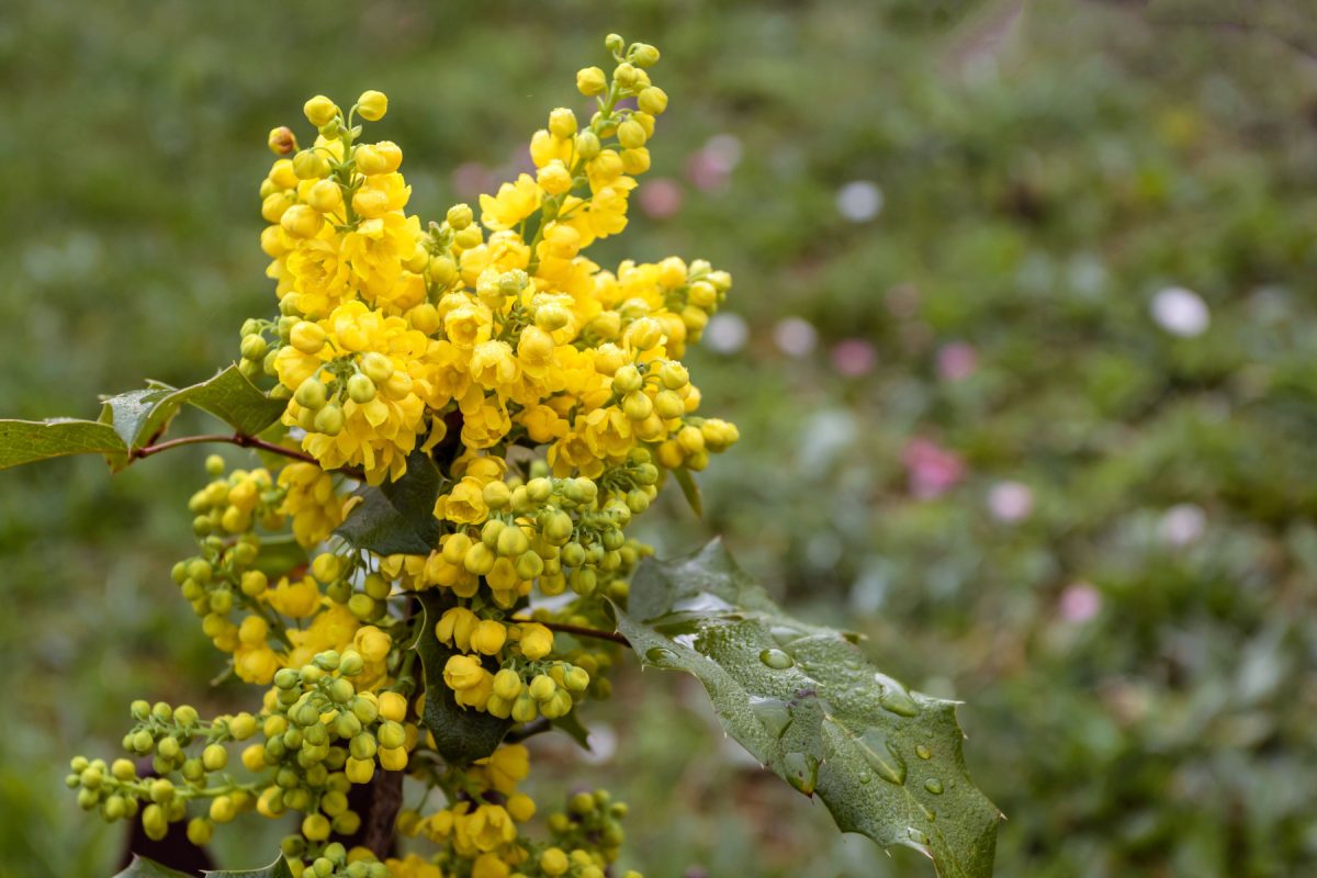 Магония падуболистная «Аполло» (Mahonia aquifolium ‘Apollo’) — это мощный пыльцевой ресурс. В апреле этот компактный кустарник покрывается плотными золотистыми шапками ароматных цветов, которые слышны насекомым издалека.
