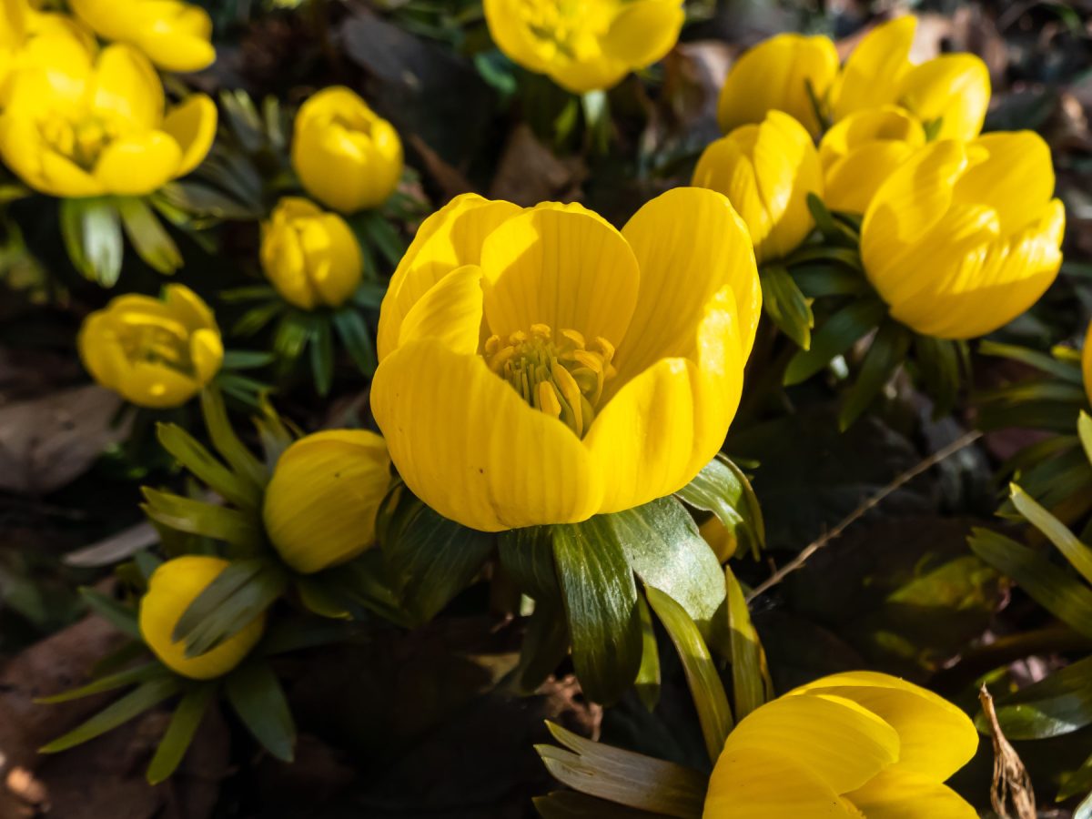 Вместе с ней из-под снега выходит эрантис зимующий, например сорт «Гинея Голд» (Eranthis hyemalis ‘Guinea Gold’). Это растение — самый быстрый старт; его открытые чашечки работают как идеальный «аэродром» для первых проснувшихся насекомых, когда кругом еще лежит снег.