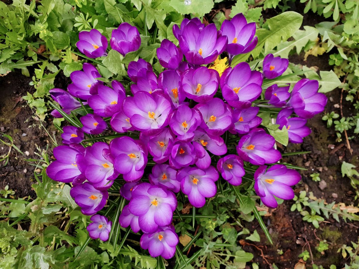 Крокус весенний работает как массовый источник питания сразу после схода снега. В тени крокусы раскрываются хуже, поэтому их лучше сажать там, где земля быстрее прогревается.. Для максимальной заметности стоит добавить сорт «Руби Джайент» (Crocus tommasinianus ‘Ruby Giant’) — он зацветает раньше большинства гибридов и дает очень яркое цветовое пятно.
