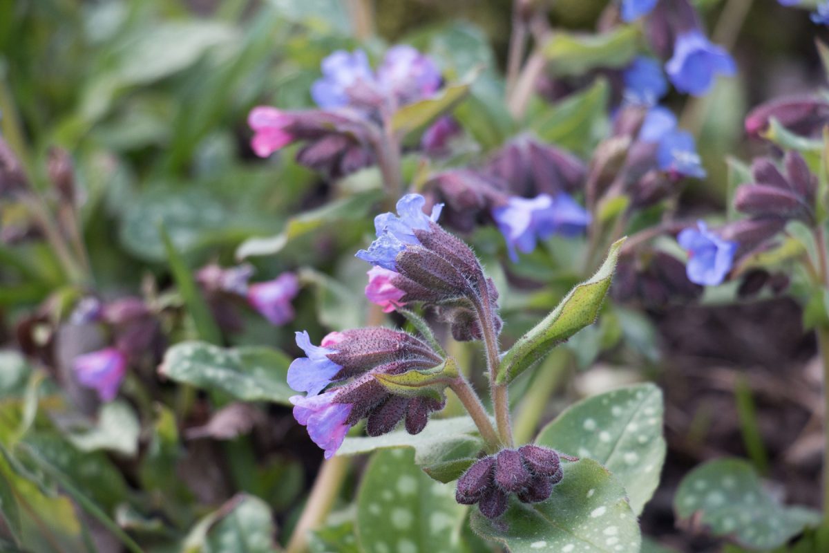 Медуница лекарственная (Pulmonaria officinalis) хороша тем, что выручает полутень. Там, где ранние луковичные цветут слабее, она часто оказывается куда полезнее. Шмели её находят охотно, а после цветения она не исчезает из посадки за счёт листвы. Особенно эффективен сорт «Миссис Мун» (Pulmonaria saccharata ‘Mrs. Moon’) — у него отличная нектаропродуктивность и красивая пятнистая листва.