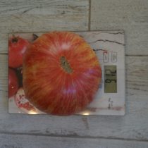 Мои впечатления: У плодов бросается в глаза очень крепкая плодоножка. Вес 700 и 900 грамм. Созревали плоды очень долго, но верх так и не вызрел. Плоды очень красивые розово-полосатые, слегка приплюснутые. У некоторых плодов стенка получилась толстая как у перца — 5 мм, и интересно хрустела. В крупных плодах осталось много невызревших прожилок, что ухудшает общее впечатление. Семян много, сменные камеры с желе большие, помидор очень сочный. Вкус томатный, очень нежный сладковатый, но нет кислинки и нет солоноватости, поэтому в салат только с солью.