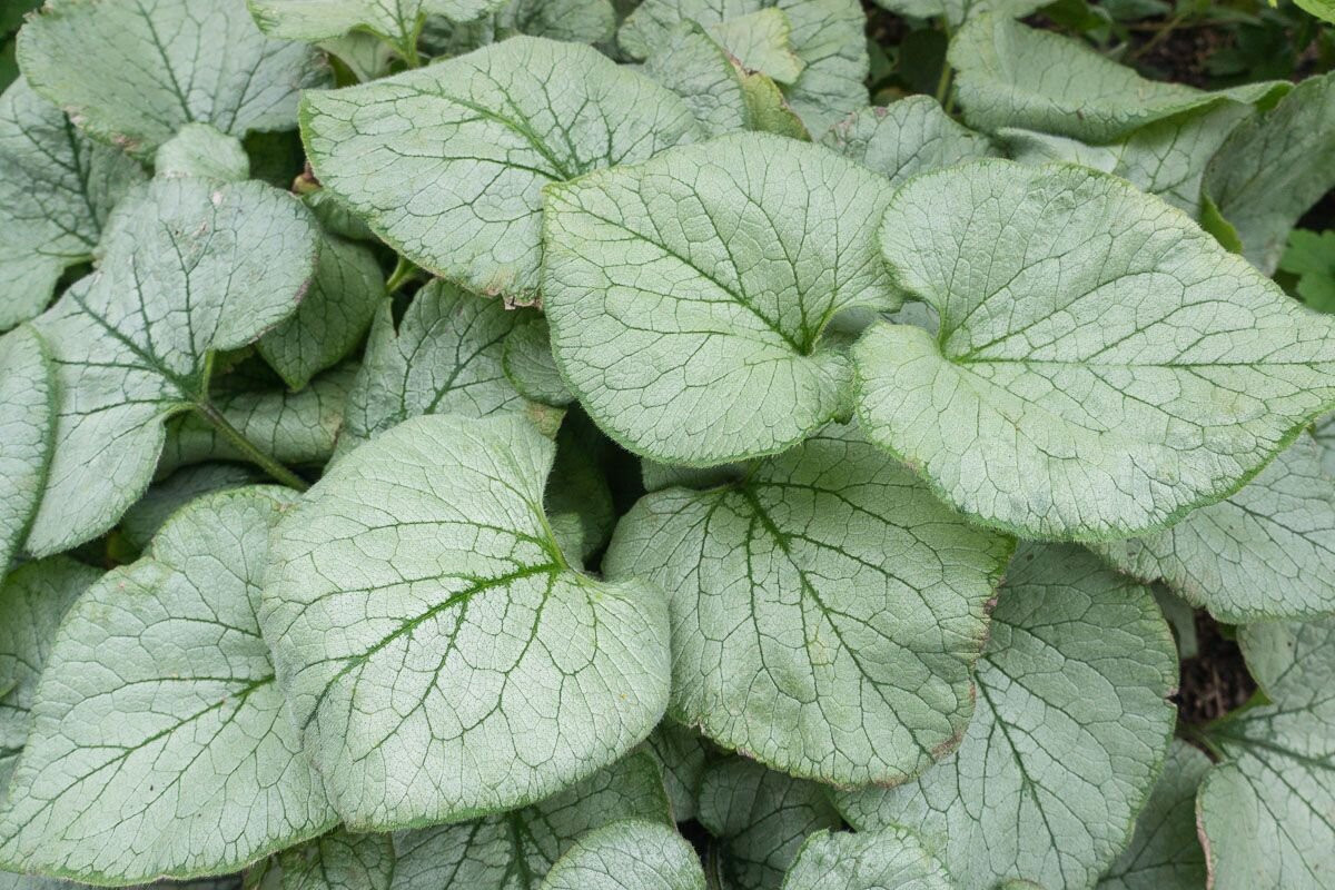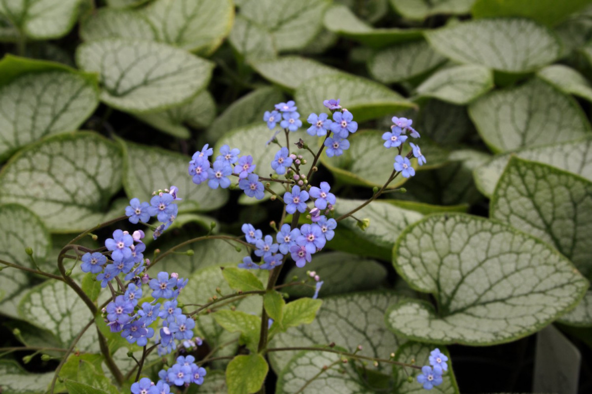 Бруннера крупнолистная (brunnera macrophylla) прекрасно растет в полутенистых местах, в том числе в приствольных кругах деревьев, образуя плотный покров. Почвы нужны влажные, умеренно плодородные, глинистые или суглинистые. Цветет в конце весны — начале лета (ранние сорта – с конца апреля, самые поздние – до начала июля) мелкими голубыми цветочками. За это получила свое второе название – незабудочник. Но главное достоинство – округло-сердцевидная листва с разными вариантами вариегатности и серебристости.