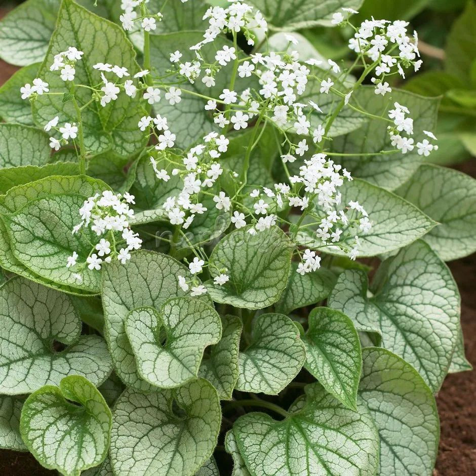 - «Силвер Вингс» (‘Silver Wings’) — бруннера высотой около 30 см с крупными зелеными листьями и регулярным рисунком из серебристых пятен.