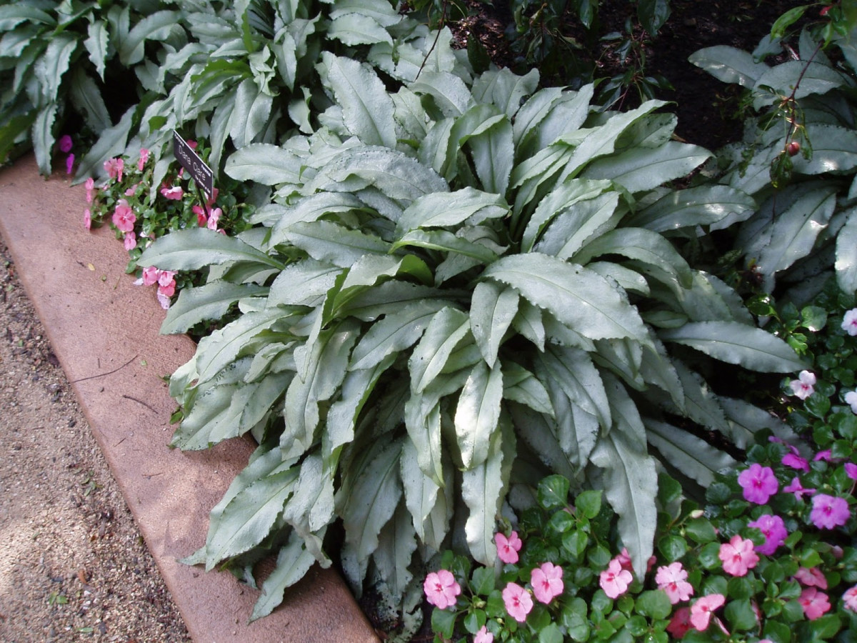 - «Лукинг Гласс» (‘Looking Glass’) — отличается серебристой листвой с тонкими темно-зелеными жилками, высота – 35 см.