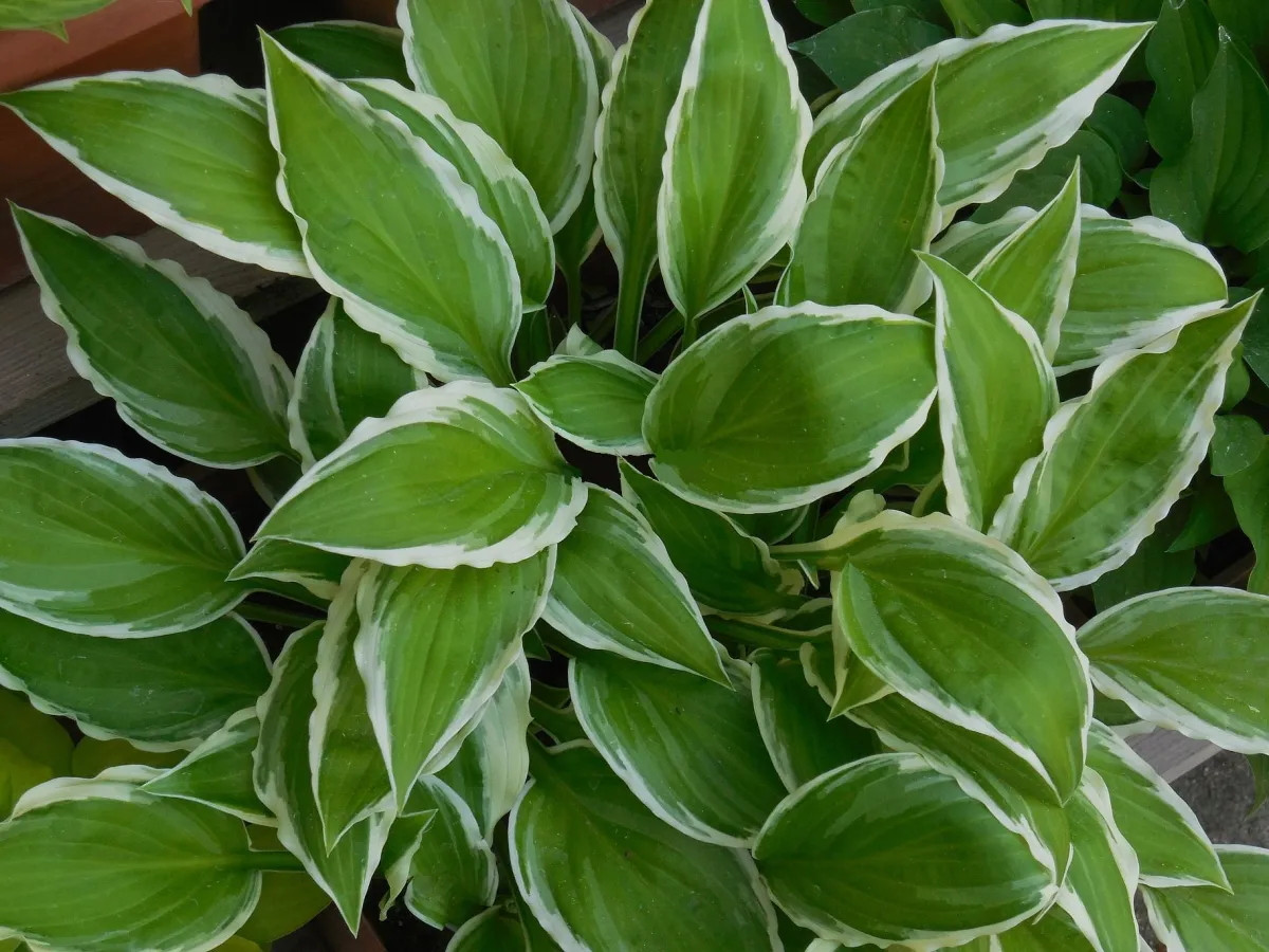 - «Вариегата» (‘Variegata’) — сорт высотой 30 см с крупными зелеными листьями и широкой неровной кремово-белой полосой по краю.