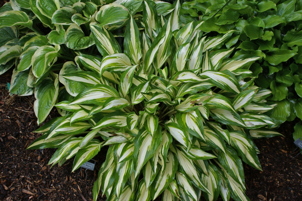 - «Черри Берри» (‘Cherry Berry’) — хоста со средней скоростью роста с длинными узкими листьями кремово-белой окраски с темно-зеленым кантом, высота – 35 см.